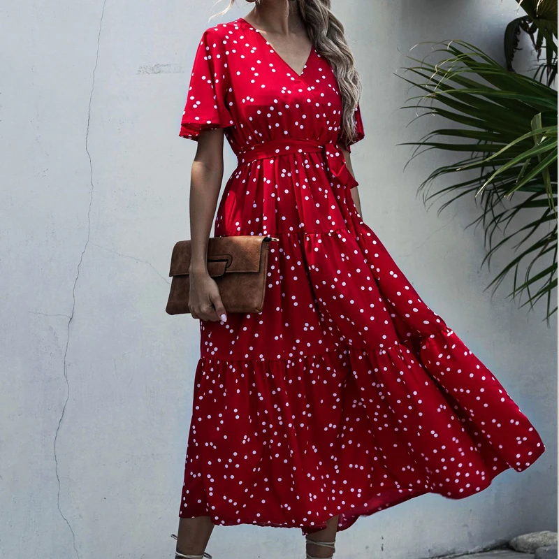 Летнее элегантное пляжное длинное платье с v-образным вырезом и поперечным поясом, женское платье с цветочным принтом в горошек 2020, женское платье в стиле бохо, vestidos