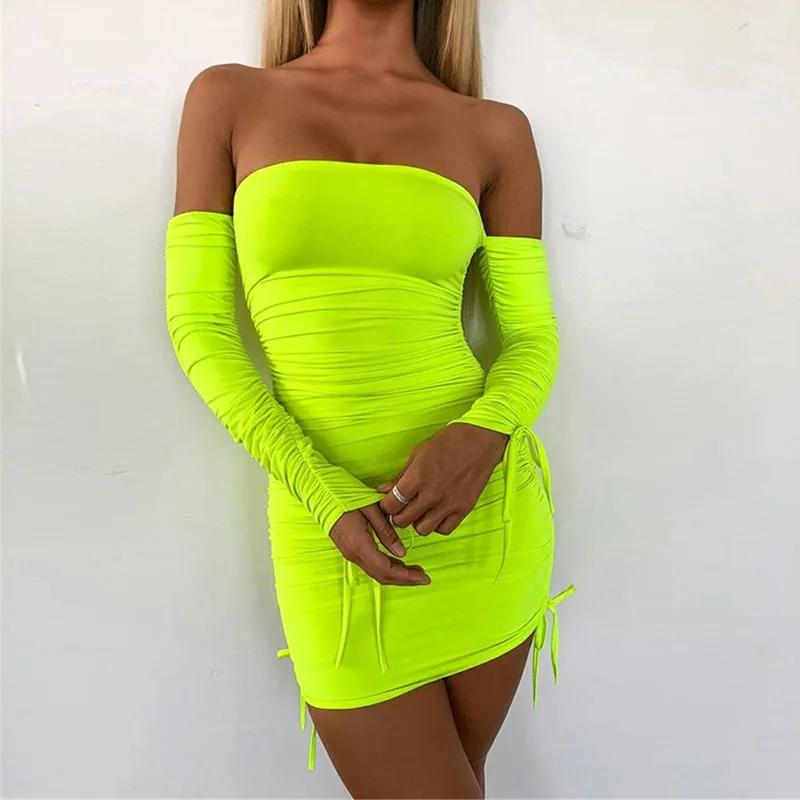 NORMOV Неоновый Зеленый Ruched облегающее платье с длинным рукавом от плеча платья 2019 сезон: весна–лето вечерние Клубные платья