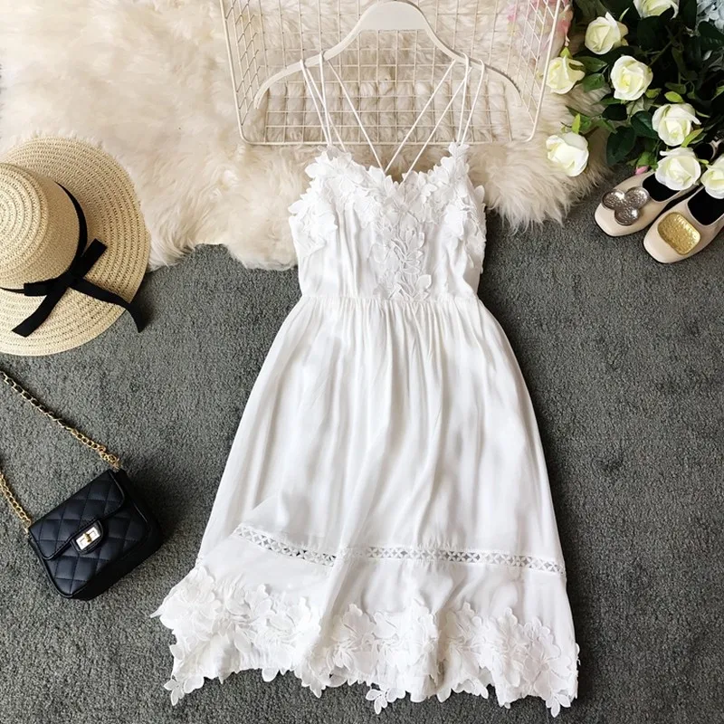 Женское платье, новинка 2020, белое, черное платье на бретелях, летнее, модное, с круглым вырезом, без рукавов, тонкое, ТРАПЕЦИЕВИДНОЕ, до середины икры, Повседневное платье на каждый день