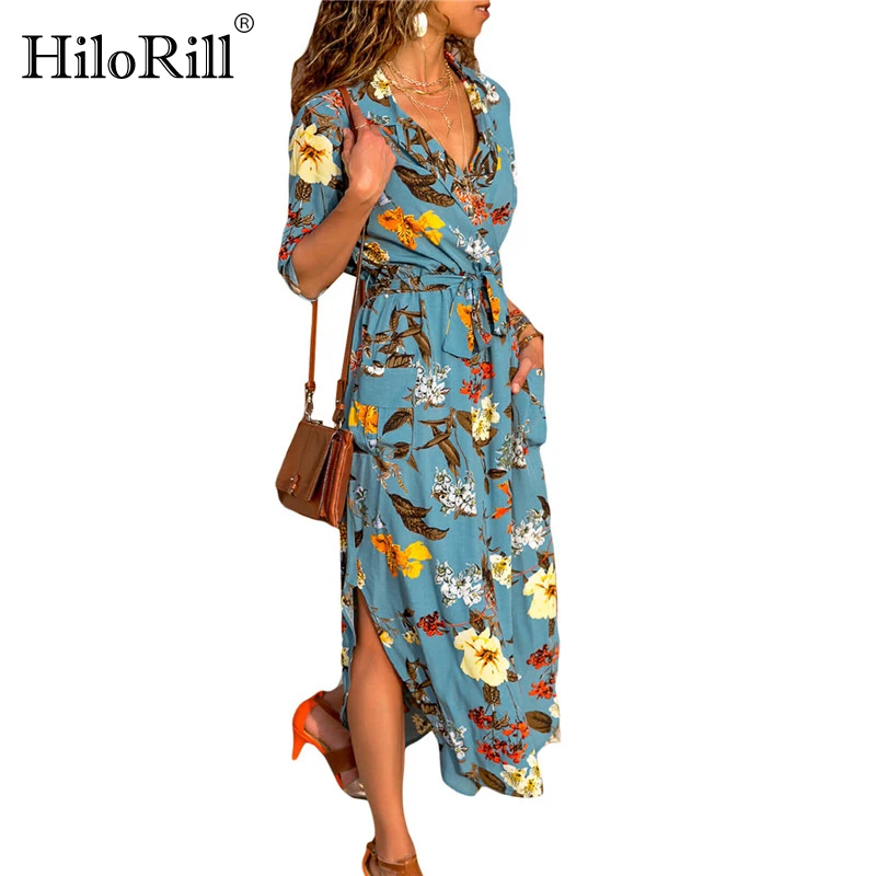 Женское пляжное платье с цветочным принтом, лето 2019, богемский, длинные шифоновые платья макси, сексуальное винтажное праздничное платье с v-образным вырезом, роковой Халат