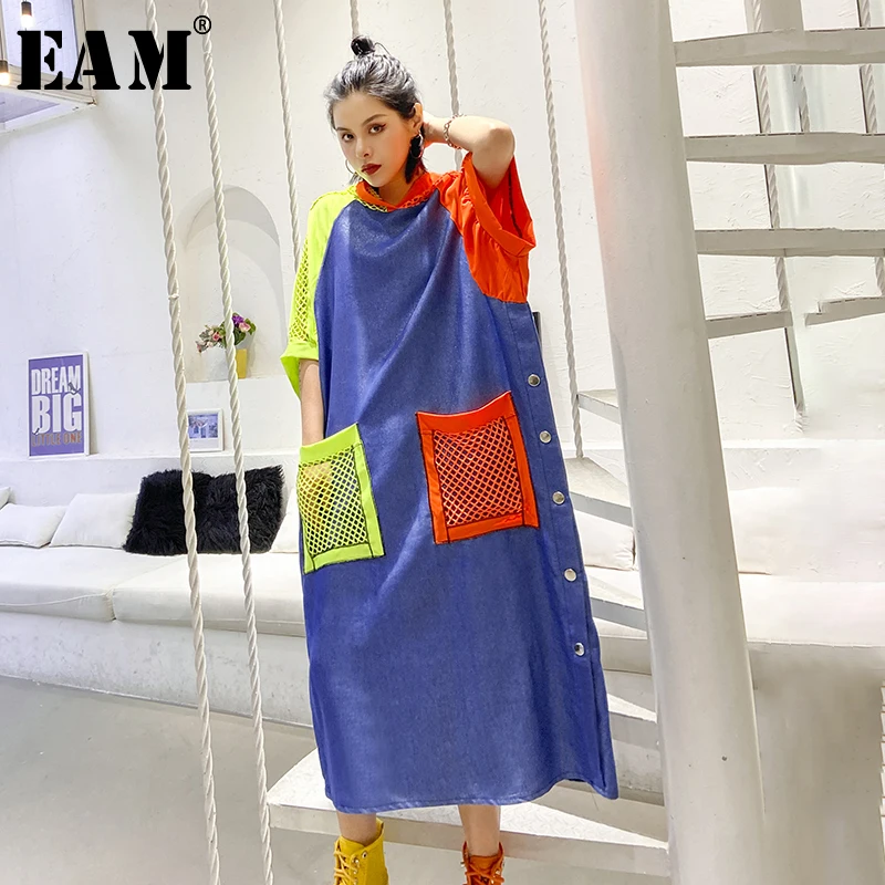Женское платье с капюшоном EAM, синее платье большого размера с карманами на кнопках и коротким рукавом, весенне-летняя мода 2020 1T843