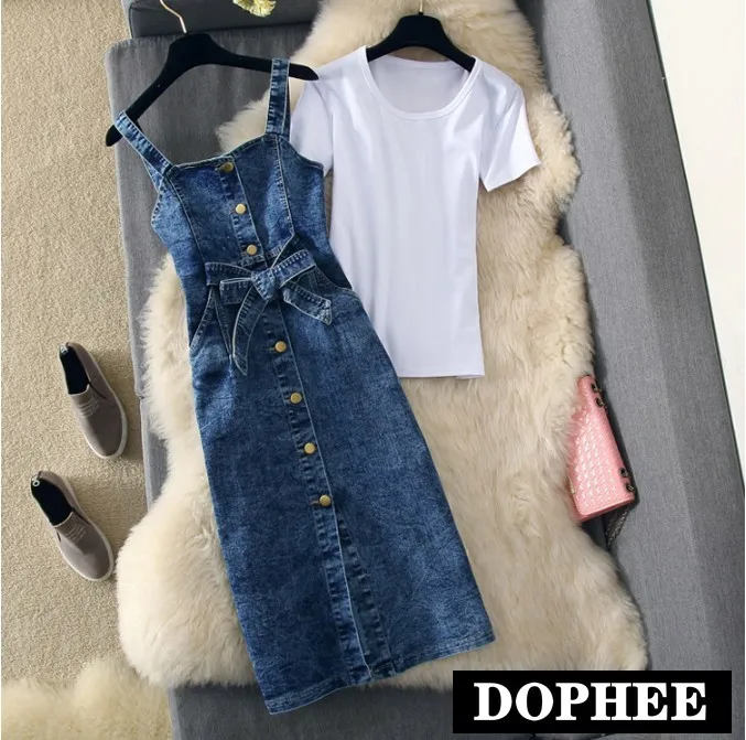 2019 г. Новинка, весна-лето, простая белая футболка для девочек в студенческом стиле + однобортное джинсовое платье на бретельках, комплект из ...