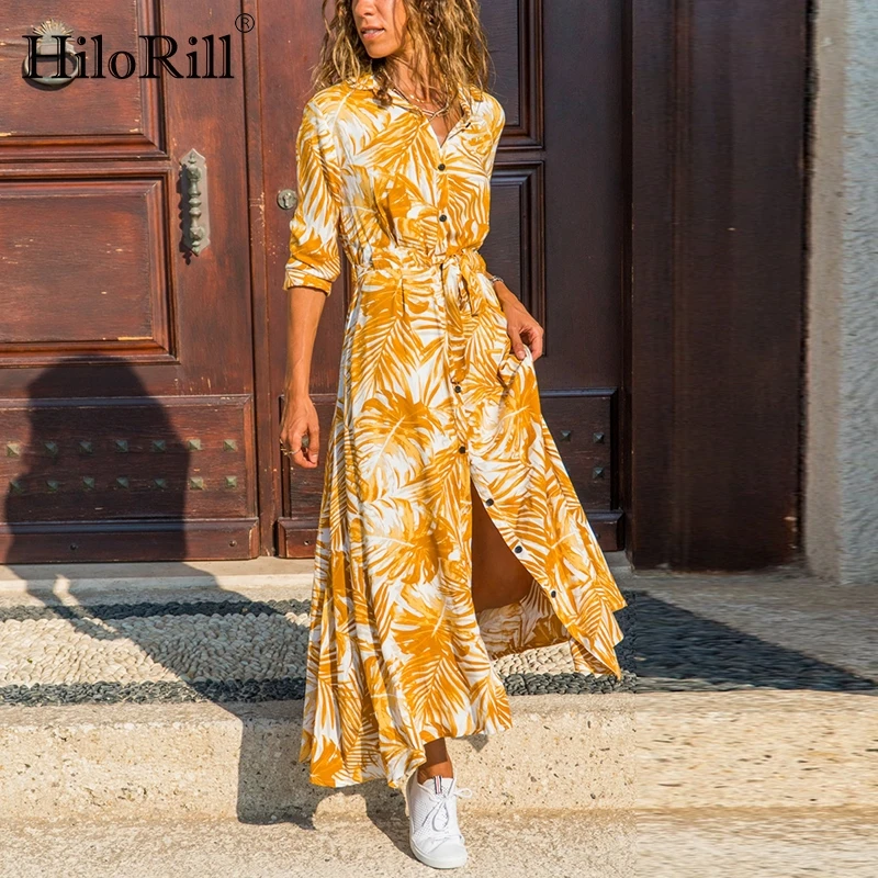 Женское длинное платье с принтом, осень-весна 2020, платье с длинным рукавом и пуговицами, Повседневное платье с отложным воротником, женские платья-рубашки с поясом