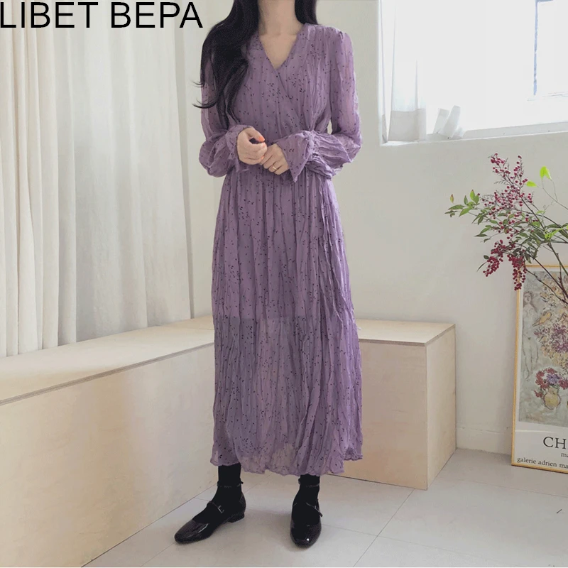2020 Новое весеннее осеннее женское шифоновое платье с цветочным принтом, в полоску, свободное, с v-образным вырезом, длинное, элегантное, с бантом, с высокой талией, повседневное, DR221