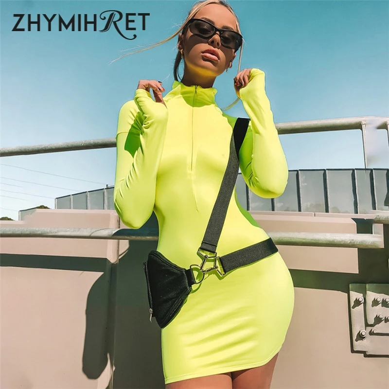 ZHYMIHRET осень 2018 г. неоновый цвет платье для женские Сексуальные облегающие молния спереди с длинным рукавом Вечерние мини Vestidos женский