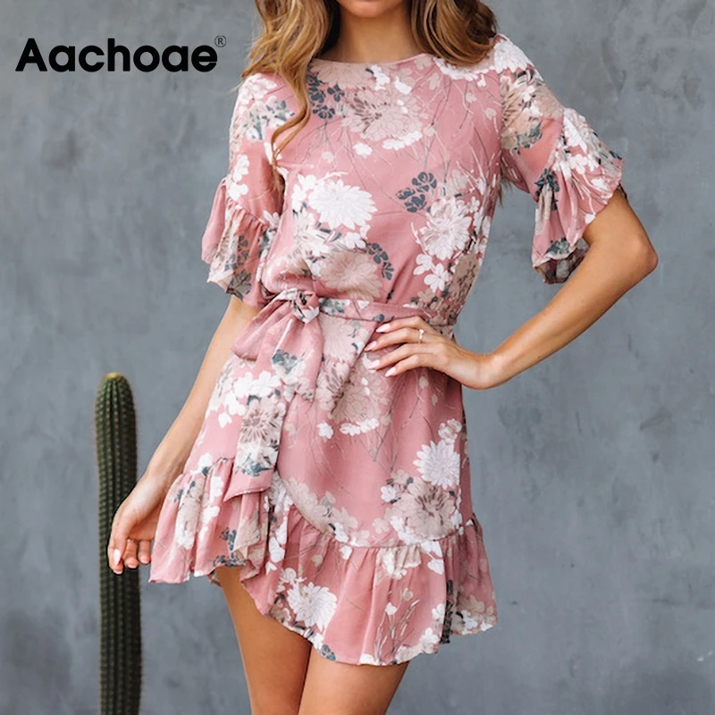 Богемное женское платье с цветочным принтом 2020 винтажное элегантное мини-платье с круглым вырезом и поясом летнее сексуальное пляжное платье с рюшами и коротким рукавом