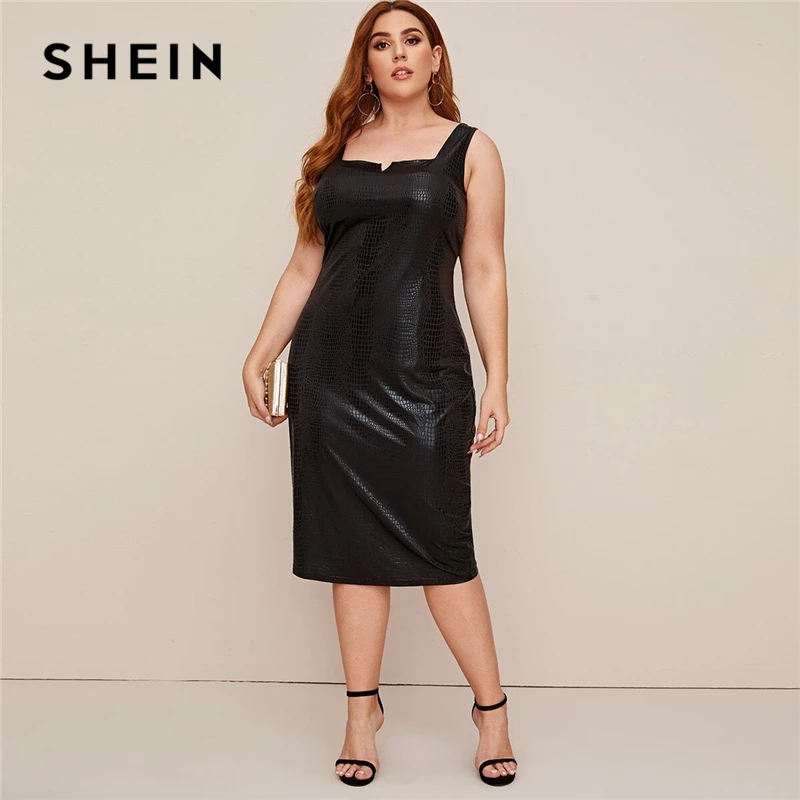 Шеин размера плюс черный крокодил искусственная кожа приталенное женское платье 2020 летнее без рукавов плюс Элегантное Длинное Платье