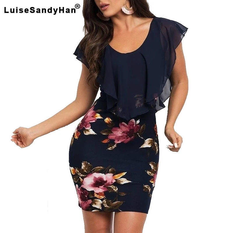 Stitching Ruffle Dress Female Slim Sexy Printed Sleeveless Back Cutout Travel Vacation Style Above Knee Mini Dress Women 2020