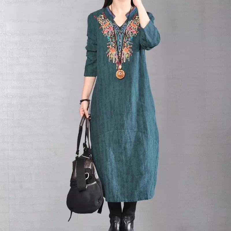 2017 большой двор осень цветок вышитые V образным вырезом хлопок белье платье весна Свободные Элегантные платья для женщин Повседневное плюс ...