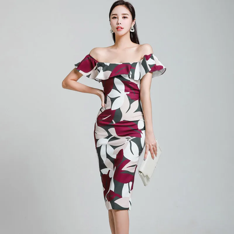 Элегантное женское платье с открытыми плечами и оборками, облегающее платье до колена с вырезом лодочкой, женское платье-карандаш, платье с ...