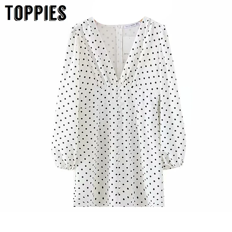 Белое шифоновое платье в горошек с рукавами-фонариками, женское сексуальное мини-платье с глубоким v-образным вырезом