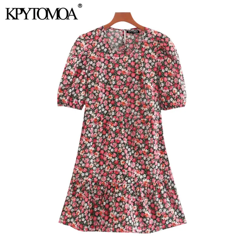 KPYTOMOA женское мини-платье с цветочным принтом, винтажное платье с круглым вырезом и пышными рукавами, модель 2020
