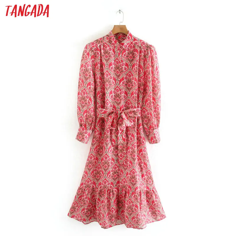 Tangada 2020 весеннее модное женское красное платье-рубашка с цветочным принтом и длинным рукавом, женское платье миди, Vestidos 2W132