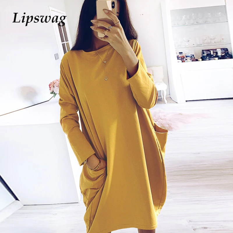 Lipswag повседневные женские платья с длинным рукавом 2019 осенние мешковатые вечерние платья с круглым вырезом модные однотонные женские плать...