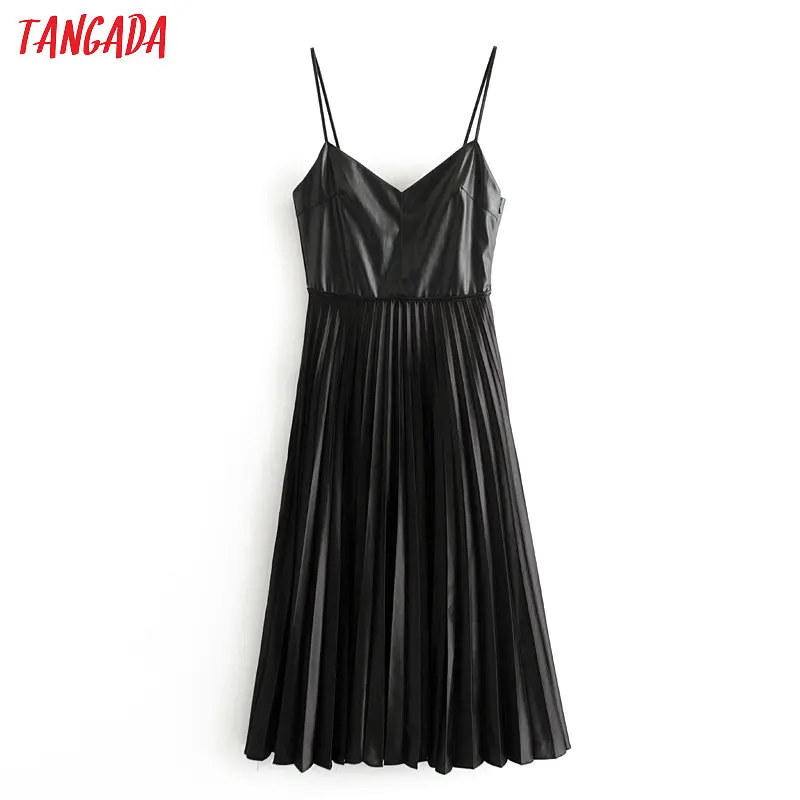 Tangada fashion women faux leather black pleated dress sleeveless ladies patchwork midi dress vestidos 3H290