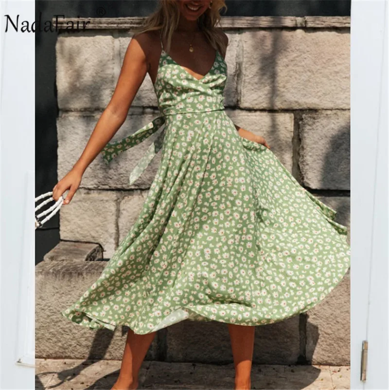 Nadafair, сексуальные пляжные платья на тонких бретельках с принтом, женское цветочное миди ТРАПЕЦИЕВИДНОЕ ПЛАТЬЕ с открытой спиной и бантом, v-образный вырез, летнее платье в стиле бохо
