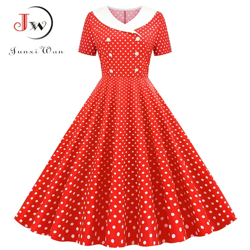 Женское летнее платье трапециевидной формы в горошек с красным воротником в стиле Питера Пэна, элегантные винтажные вечерние платья средне...