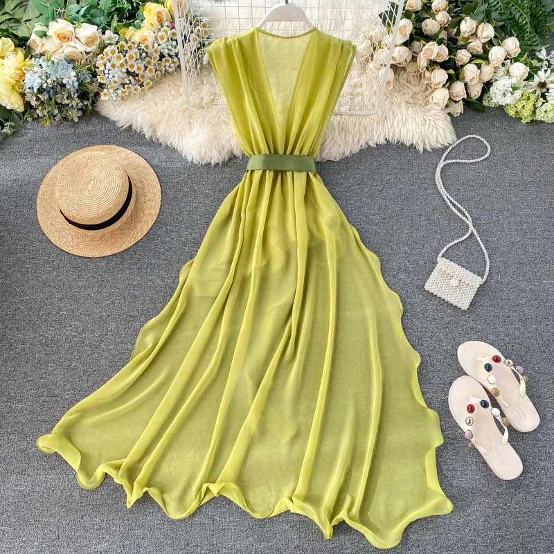 Для женщин летние платья Лидер продаж корейский стиль Дизайн Одежда Тонкий линии Винтаж Кнопка V образным вырезом живота платье дл