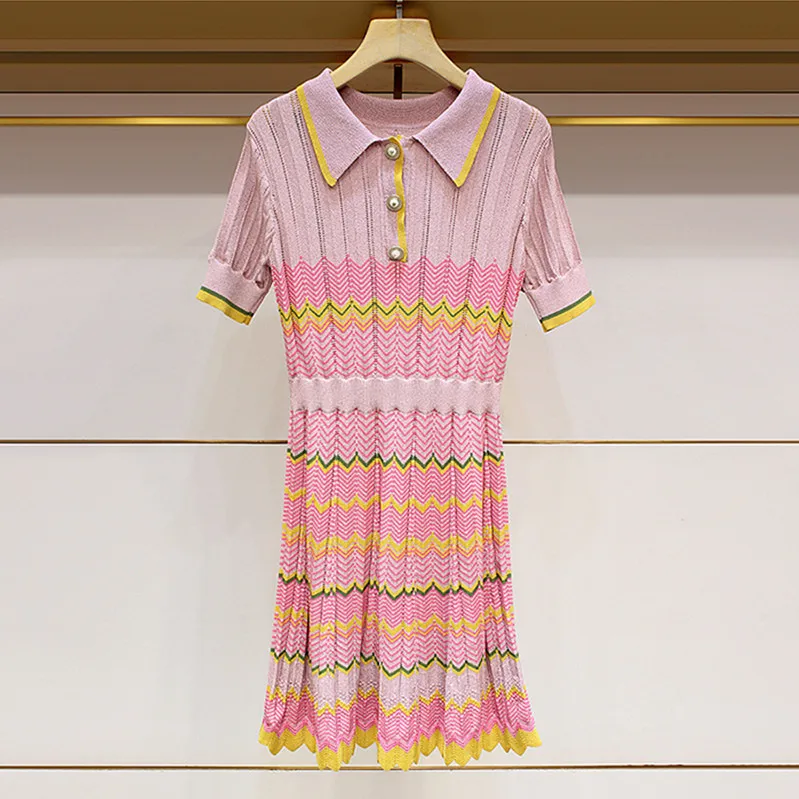 Элегантное Полосатое трикотажное платье-свитер «папа», новое летнее мини-платье с коротким рукавом и отложным воротником, 2020