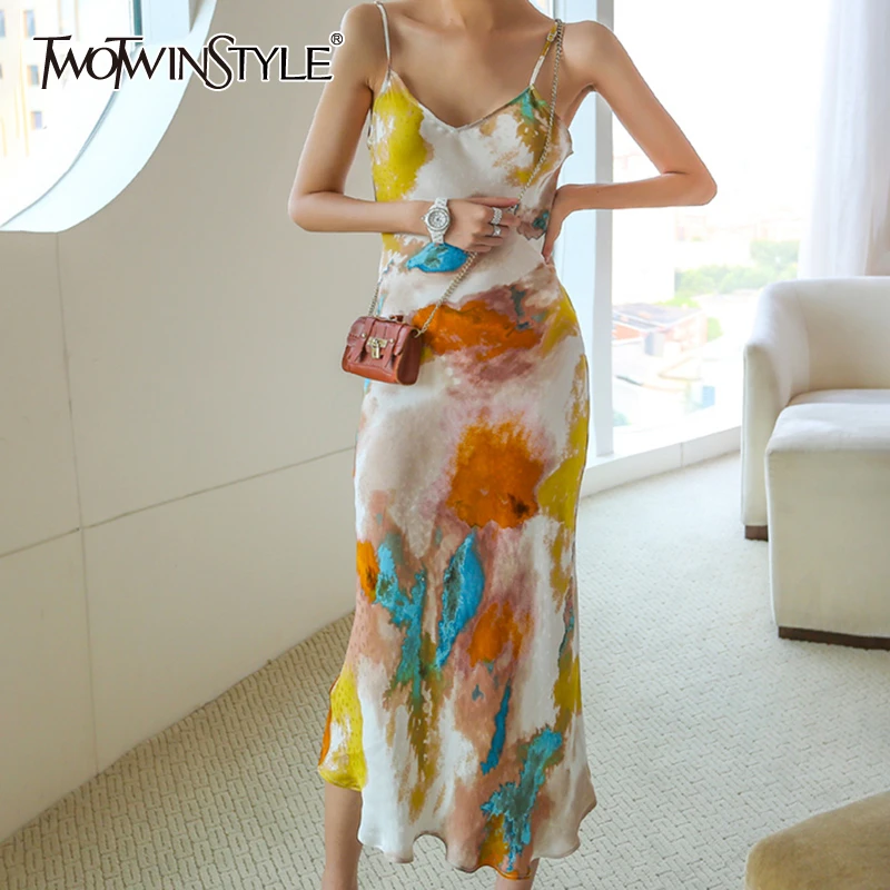 TWOTWINSTYLE винтажное платье с принтом для женщин квадратный воротник спагетти ремень Высокая талия тонкие платья для женщин 2020 Осенняя мода Но...