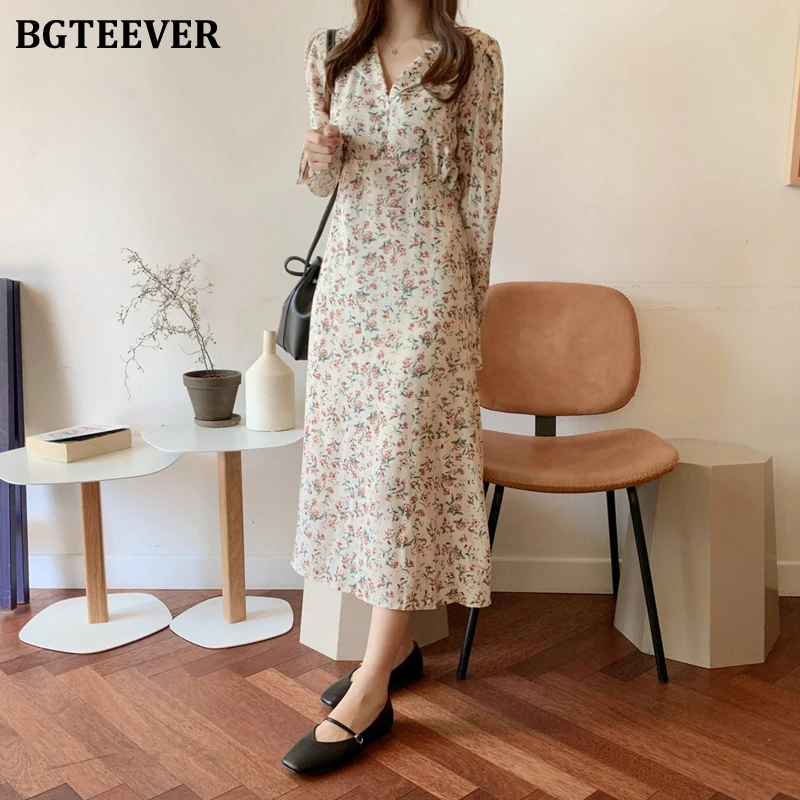 BGTEEVER, винтажное женское платье с v-образным вырезом и цветочным принтом, на пуговицах спереди, на шнуровке, женское праздничное платье, зимнее, с длинным рукавом, vestidos Femme 2019