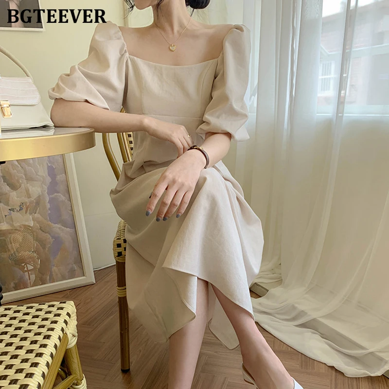 BGTEEVER винтажное женское платье с рукавами-фонариками и квадратным воротником, летнее хлопковое и льняное женское платье с открытой спиной, 2020, ТРАПЕЦИЕВИДНОЕ ПЛАТЬЕ Vestidos femme