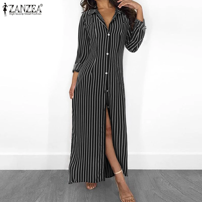 Женское длинное платье-макси в полоску ZANZEA, повседневное пляжное платье с отложным воротником и пуговицами, Пляжное Платье с разрезом, лето 2020