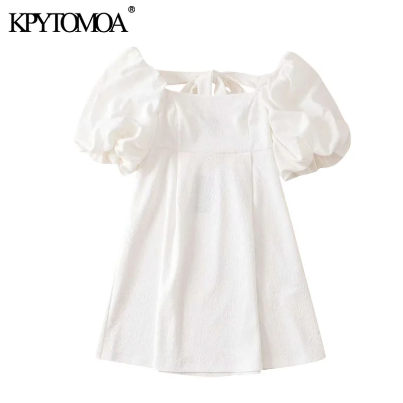 KPYTOMOA женское милое модное Плиссированное мини-платье с пышными рукавами, винтажные женские платья с квадратным воротником и открытой спиной с бантом