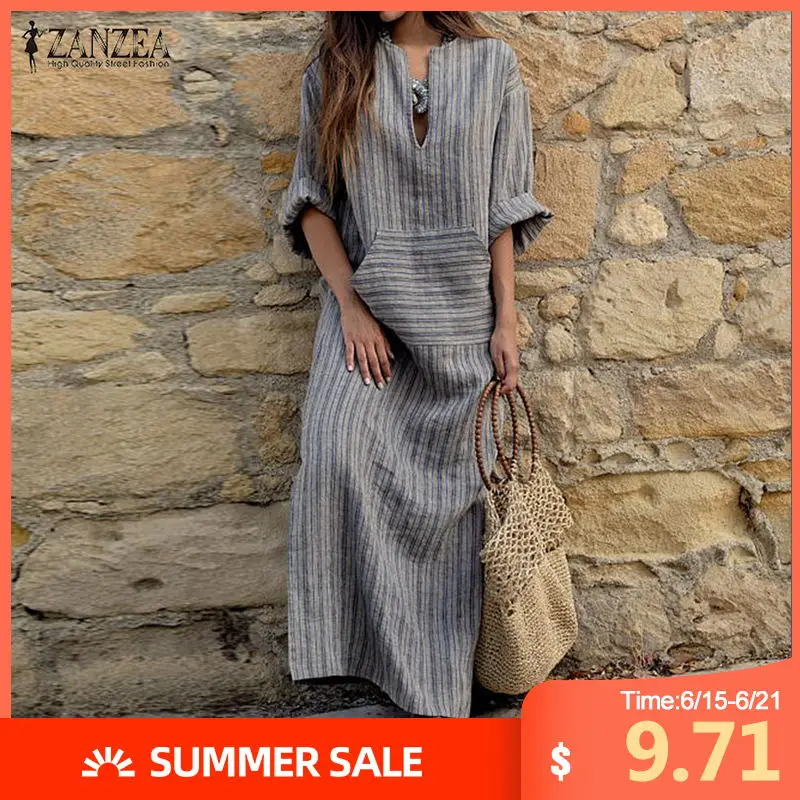 2019 ZANZEA летнее винтажное женское платье с v-образным вырезом и рукавом 1/2, повседневное свободное хлопковое льняное платье Vestido, однотонные вечерние Сарафаны с разрезом на подоле