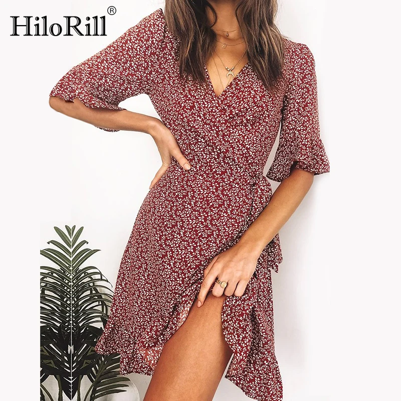 Повседневное летнее платье Для женщин богемский Цветочный принт элегантное пляжное платье Винтаж оборками Открытое платье без рукавов сексуальный глубокий v-образный вырез с разрезом Мини Вечерние платья