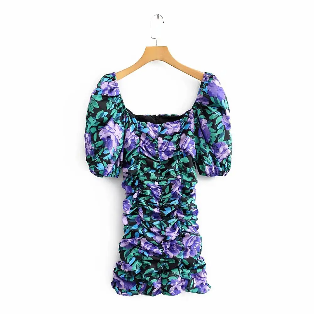 Новое Женское винтажное Плиссированное мини-платье с квадратным воротником и пышными рукавами с цветочным принтом, женские шикарные платья с молнией сзади DS3263