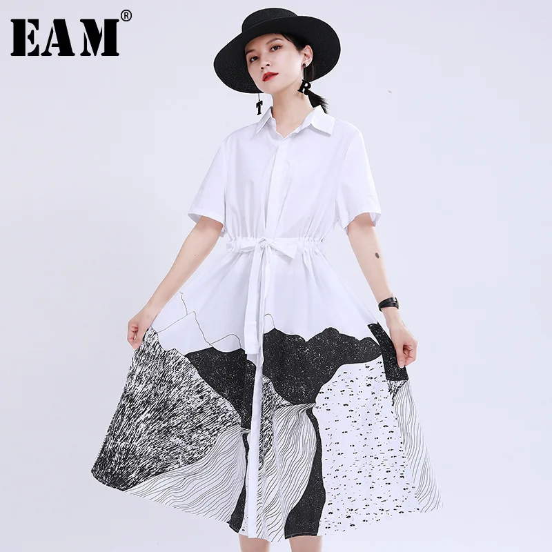 Женская блузка с кулиской EAM, черная Свободная блузка с принтом и коротким рукавом, 1U172, весна-лето 2020