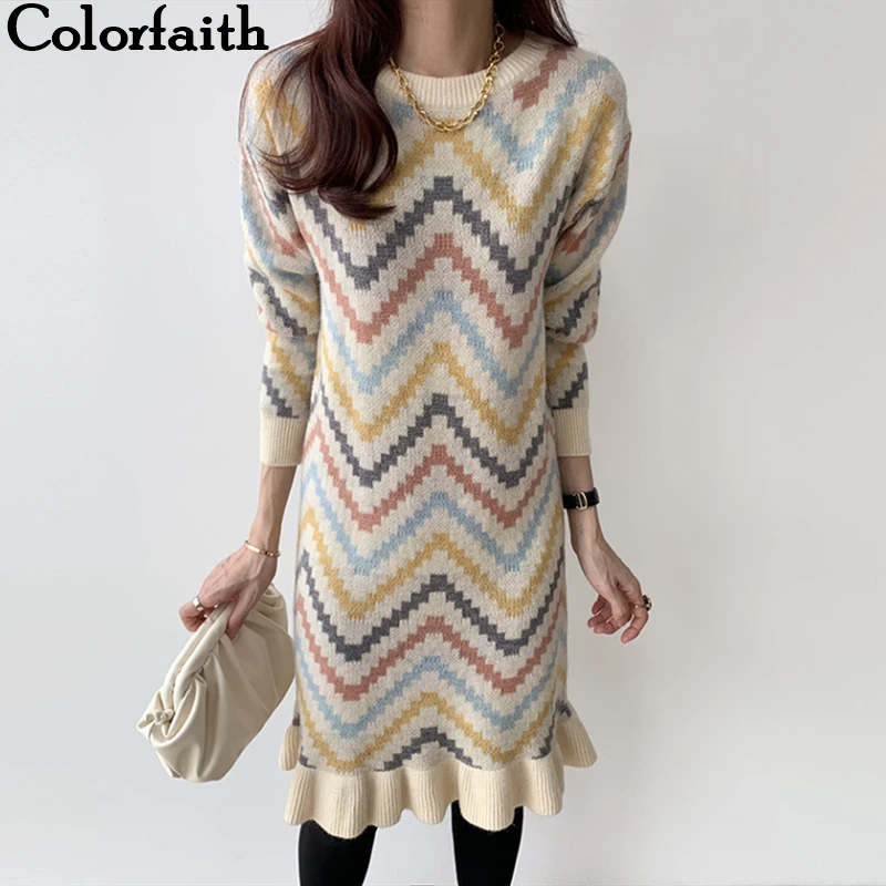Colorfaith, новинка 2019, Осень-зима, женские платья с оборками, милое, вязанное, прямое, теплое, корейский стиль, элегантное, повседневное, женское, DR7757
