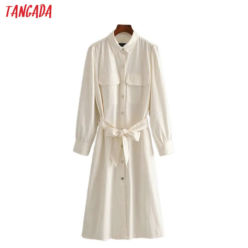 Tangada 2020 женское джинсовое белое платье с разрезным карманом и отложным воротником с длинным рукавом, женское элегантное платье миди, Vestidos 3H455
