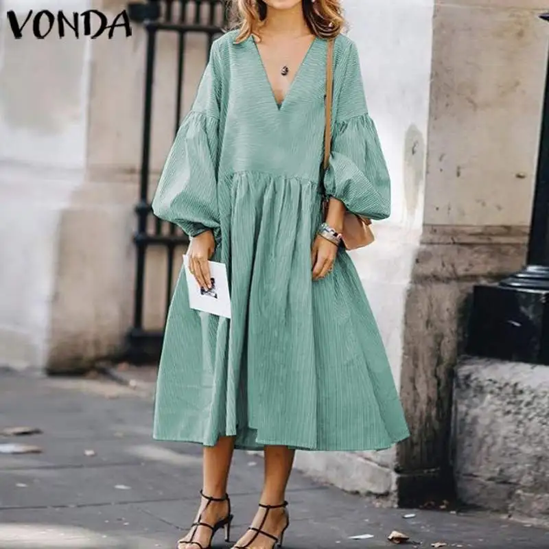 VONDA женское платье большого размера 2019 винтажное платье с v-образным вырезом и длинным рукавом-фонариком до середины икры Vestido богемное осеннее платье офисное женское летнее платье