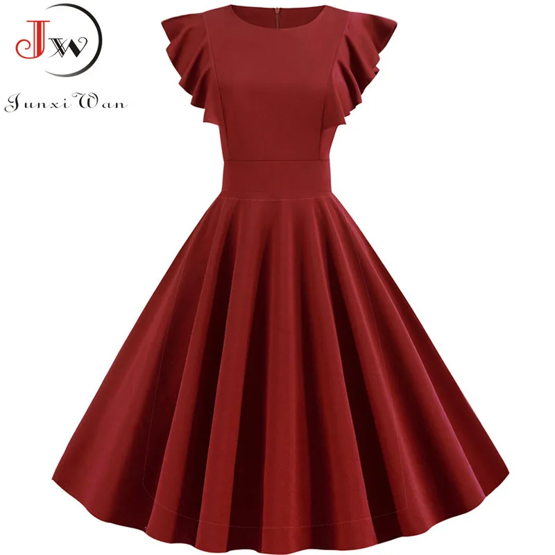 2019 женское винтажное летнее платье 50 s 60 s однотонные элегантные платья с рукавами-лепестками для вечеринок роковой Плюс Размер повседневны...