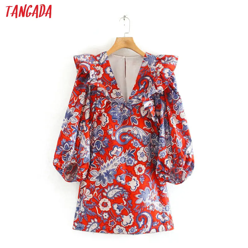 Tangada женское красное мини-платье с цветочным принтом, Пышное Платье с длинным рукавом и v-образным вырезом, винтажное короткое платье vestidos 2XN25