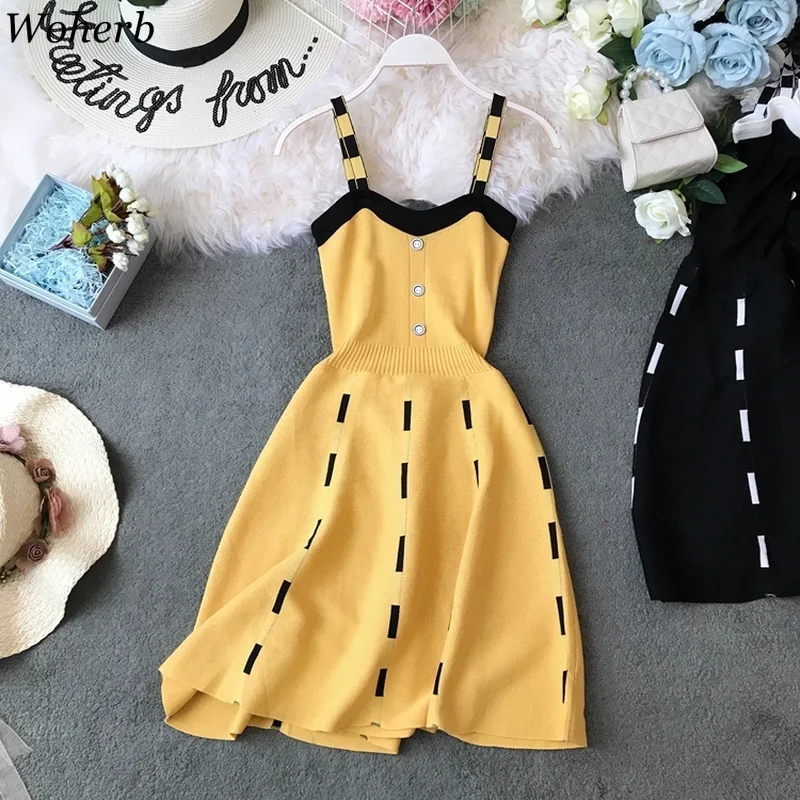 Woherb/летнее Милое трикотажное платье-майка трапециевидной формы для женщин 2019, новые модные полосатые контрастные миди платья женские повсе...