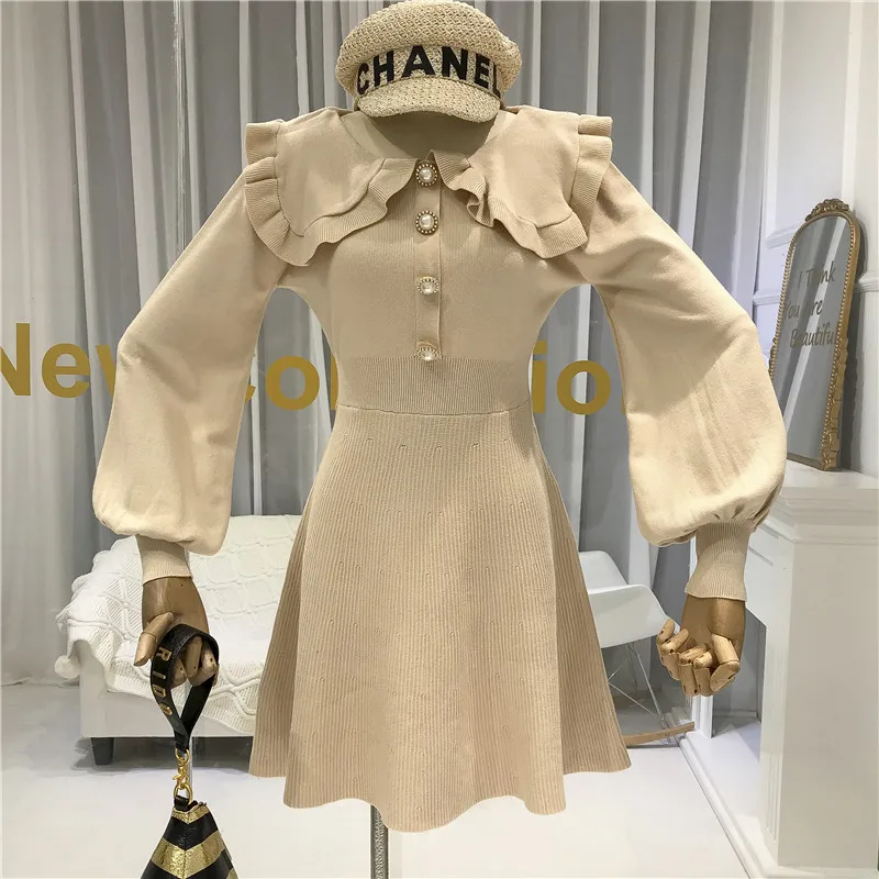 Новинка 2019, осень/зима, ретро-кукла, воротник, вязаное платье, женский, для девушек, милый, длинный рукав, свитер, платья трапециевидной формы