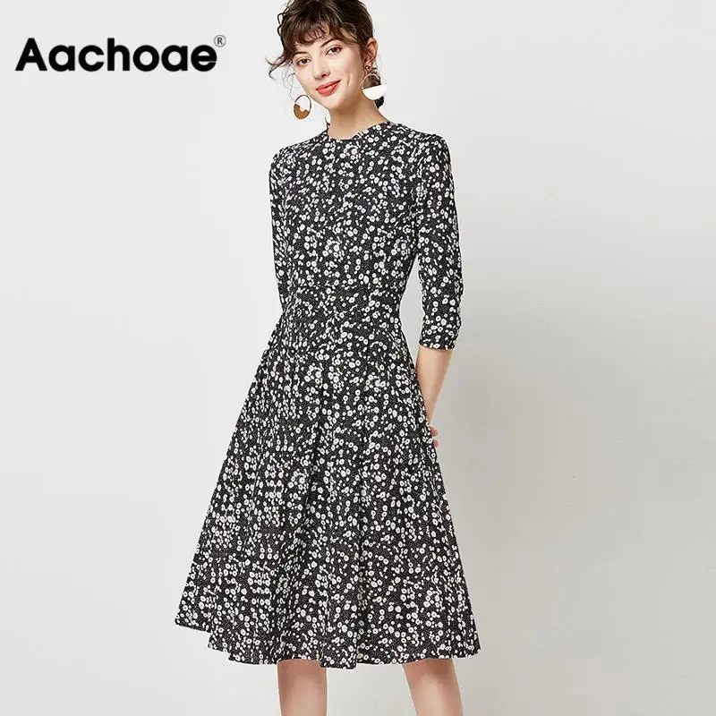 Женская Повседневная складчатая одежда с круглым вырезом 2019 винтажное элегантное платье миди с цветочным принтом три четверти рукав женск...