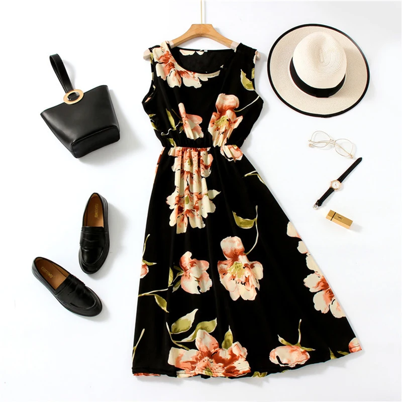 Летнее женское платье Плюс Размер Повседневная миди Работа Офис Вечерние Вечеринка Сарафаны без рукавов цветочный принт элегантные винтаж...