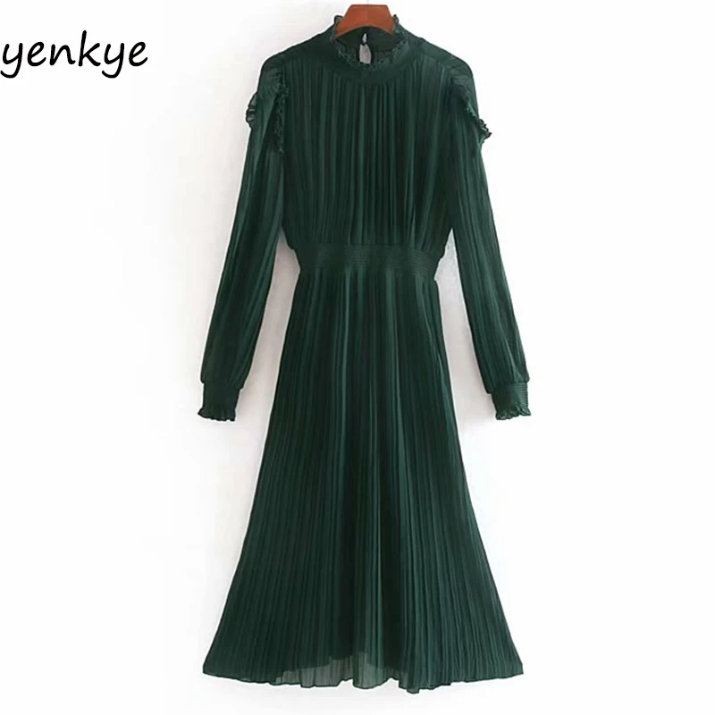 Винтажное зеленое плиссированное платье миди, женское повседневное шифоновое платье с высокой горловиной, длинным рукавом и эластичной та...