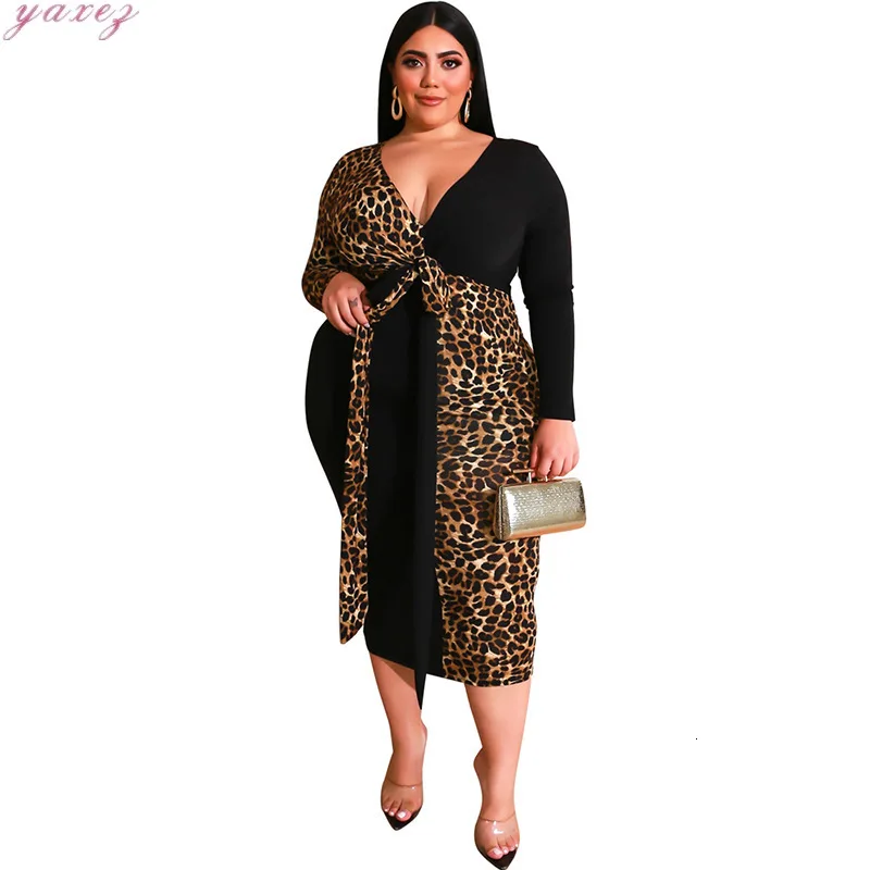 Платья размера плюс с v-образным вырезом, женские вечерние бандажные леопардовые Лоскутные обтягивающие платья с поясом и длинными рукавам...