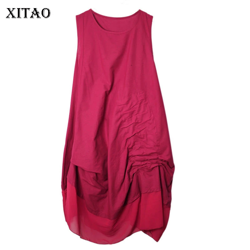 [XITAO] 2019 весна лето новый в Ретро этническом стиле сплошной цвет Асимметричный без рукавов с круглым вырезом лоскутное драпированное платье ...
