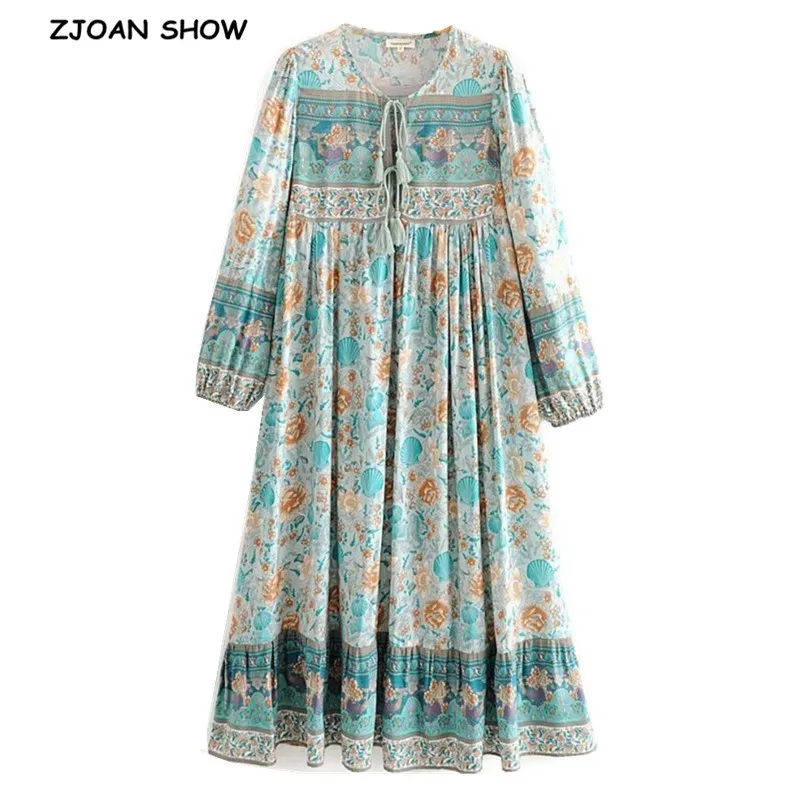 2020 богемное длинное платье на шнуровке с v-образным вырезом и цветочным принтом, женское пляжное платье с длинным рукавом и кисточками