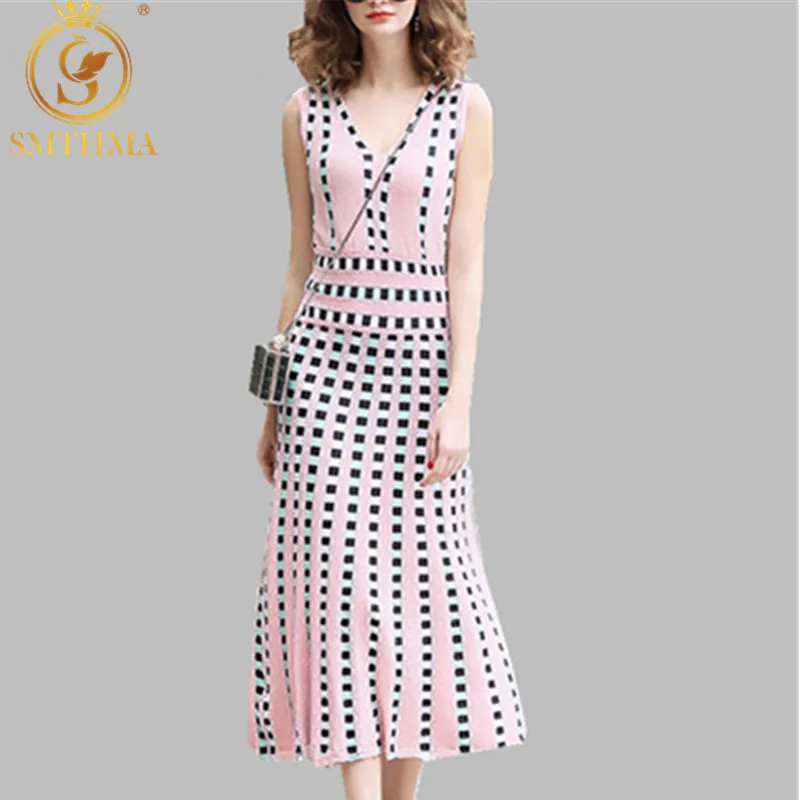 Женское платье без рукавов, женское розовое трикотажное облегающее платье-пуловер в клетку с V-образным вырезом, лето 2019