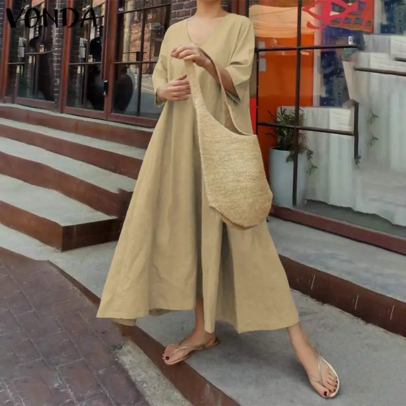 Хлопковое льняное платье для женщин, винтажные однотонные вечерние платья, богемное пляжное платье VONDA 2020, летнее женское Повседневное плат...