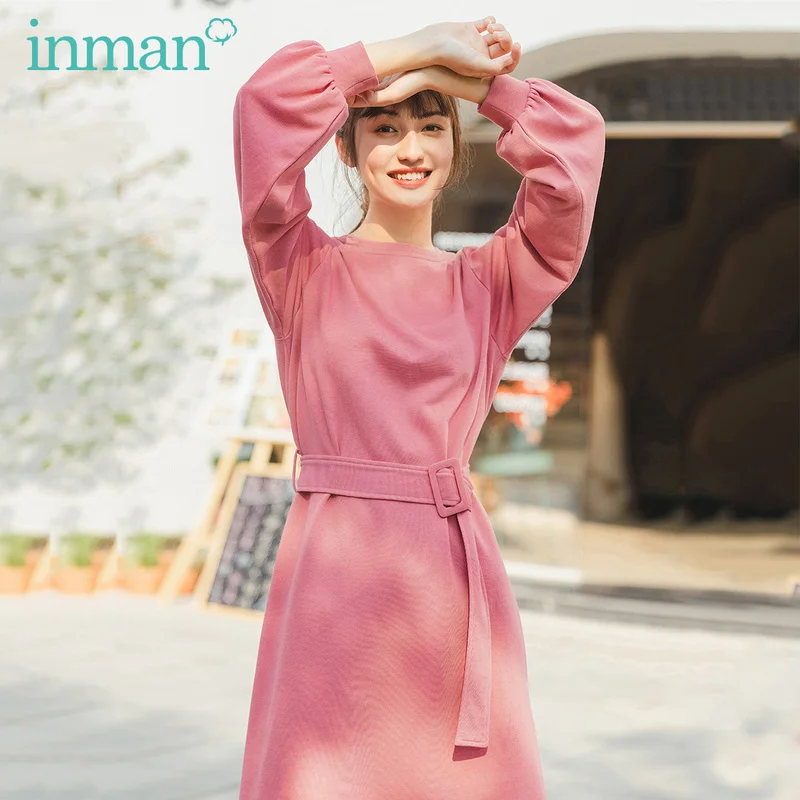 INMAN, весна 2020, Новое поступление, модное однотонное платье с круглым вырезом и длинными рукавами с поясом