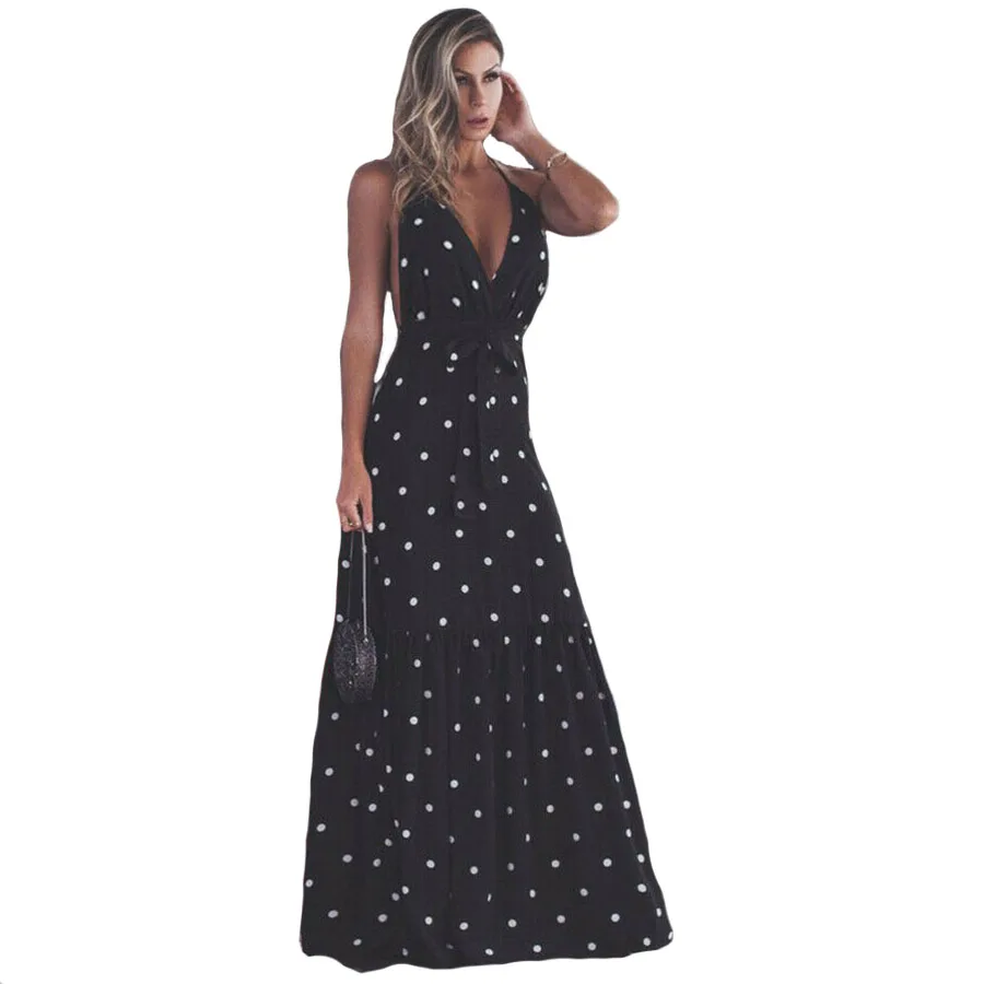 Модное женское Платье макси с открытой спиной и открытой спиной в горошек, летняя женская вечеринка, повседневные праздничные длинные плат...