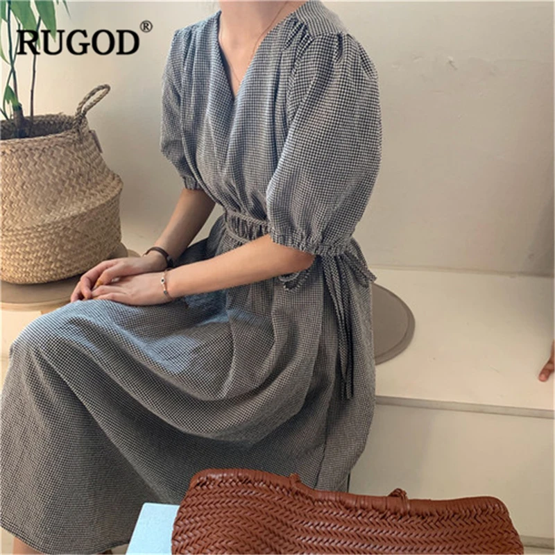 RUGOD 2019 новое поступление женское клетчатое тонкое платье с v-образным вырезом, плиссированное плечо, шнурок, Vestidos, винтажная мода, темперамен...